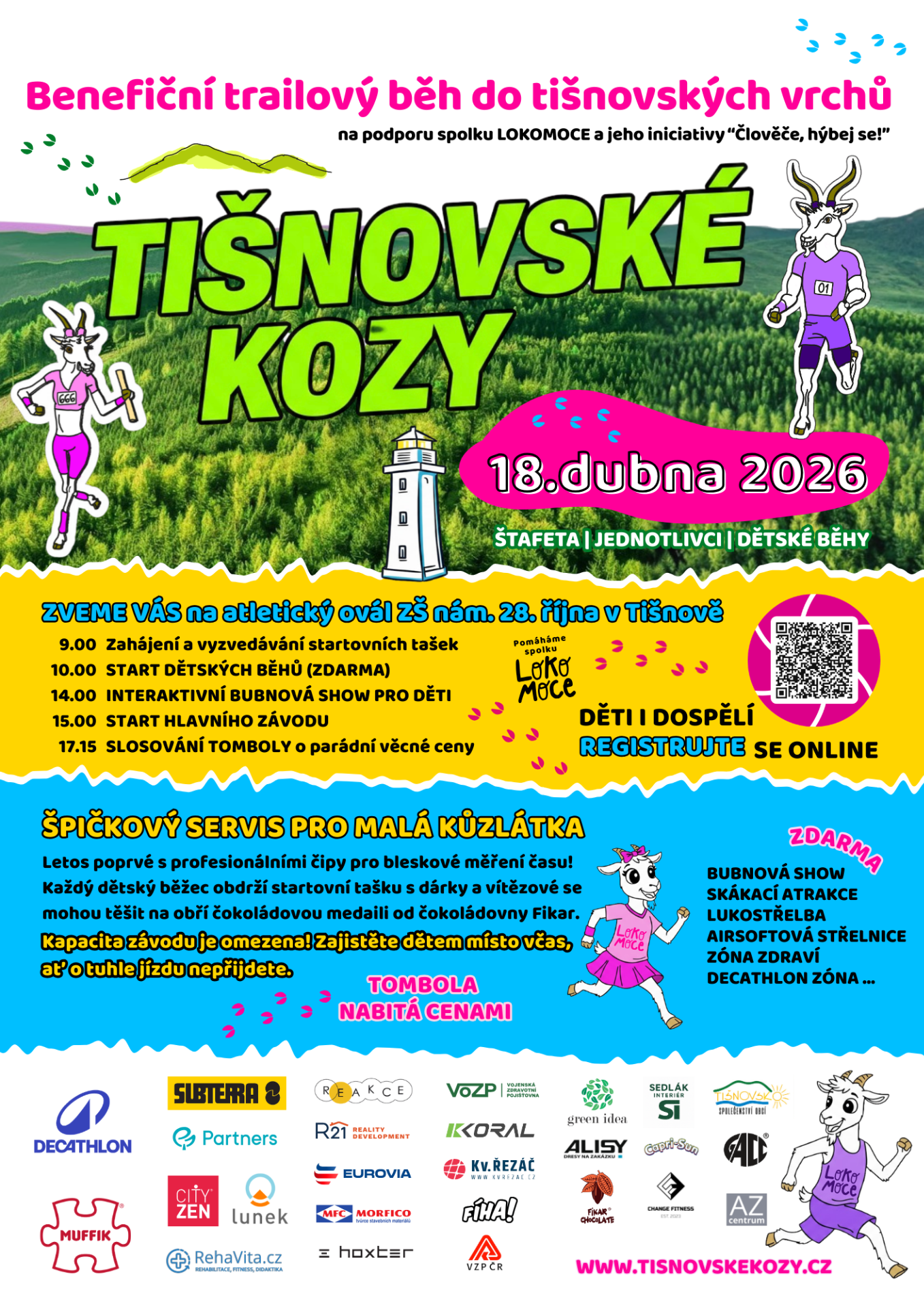 Malá kůzlátka vyrazí na trať, letos poprvé s profesionálními čipy pro bleskové měření času! Drobné dárky pro každého běžce, vítězové se mohou těšit na obří čokoládovou medaili od čokoládovny Fikar.